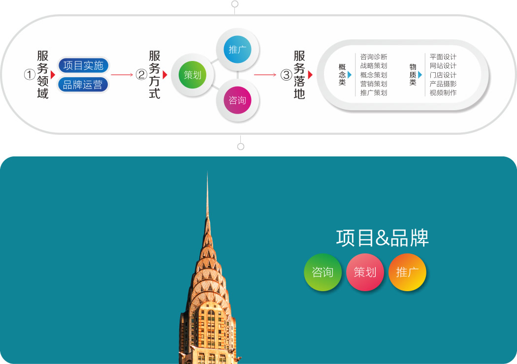 一站式服務(wù),能保證品牌各個環(huán)節(jié)呈現(xiàn)出的作品,能形成一個相對平衡的整體形象水準(zhǔn),避免因?yàn)椴煌痉?wù)而造成的參差不齊。